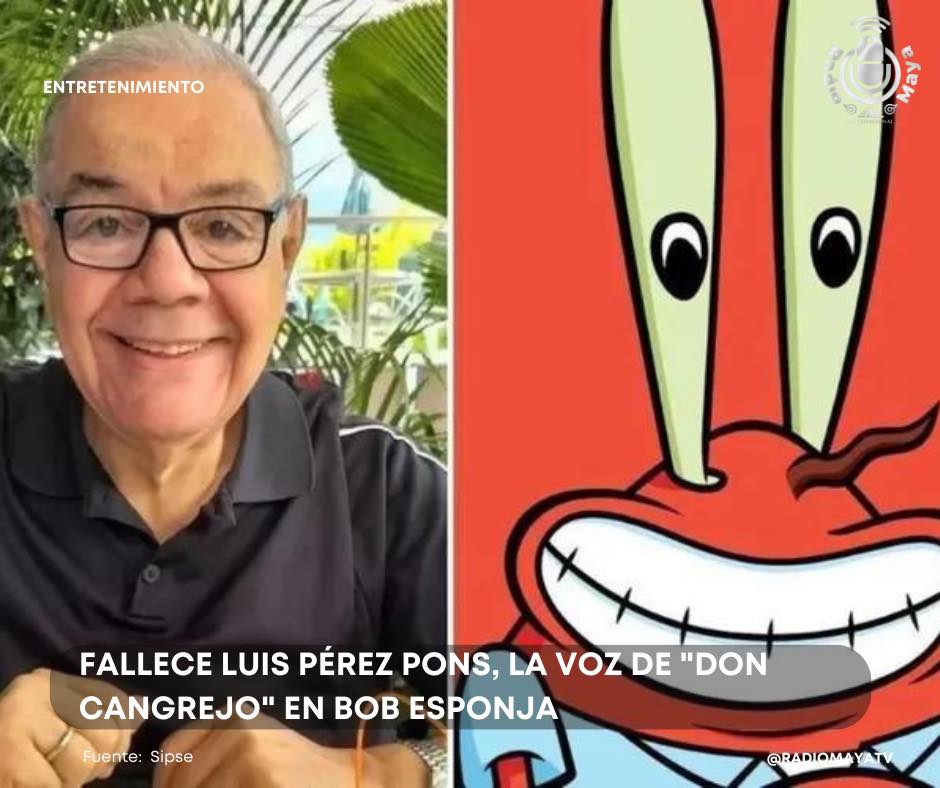 El reconocido locutor, conductor y actor de doblaje venezolano, Luis Pérez Pons, quien proporcionó la voz al personaje de "Don Cangrejo" en la serie animada de Bob Esponja, falleció a la edad de 72 años. La triste noticia fue compartida en redes sociales por su colega de doblaje, Luis Carreño, quien también dio voz a Bob Esponja en español latino.